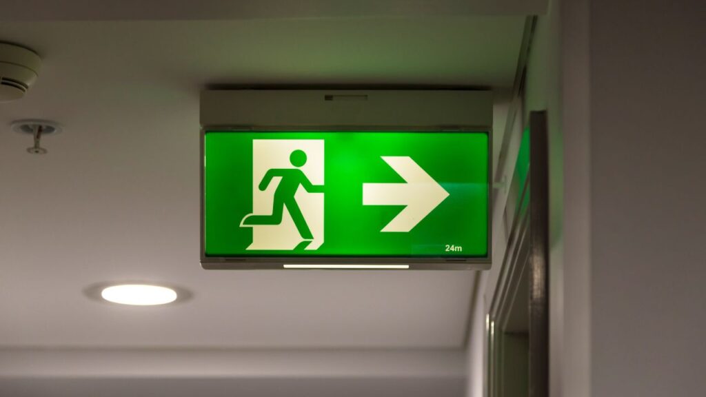 Placas e sinalizações para orientação de rotas de fuga e uso correto de equipamentos.